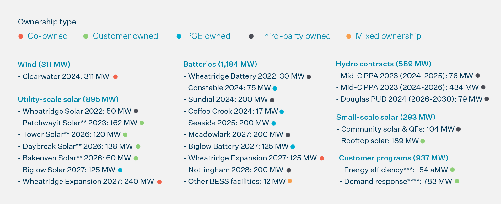 * Through ownership, power purchase agreements (PPA), contract or customer participation in programs.