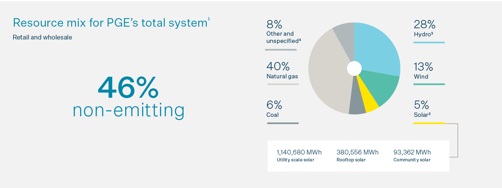 Percentages above represent 2025 resource mix from PGE’s total system load, inclusive of wholesale and retail volumes. The percentage of 2025 retail loads as defined by Oregon Department of Environment Quality (ODEQ), which excludes wholesale sales, served by non-emitting resources is 40%. This resource mix does not include battery storage. Refer to the appendix for additional information.