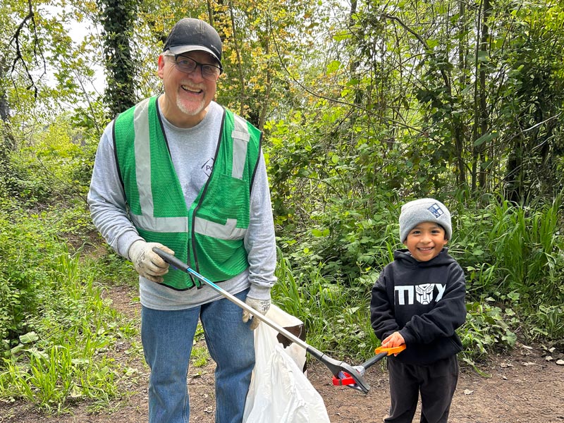 PGE Vice President Larry B. and Lorena's son cleaning up a Salem park.