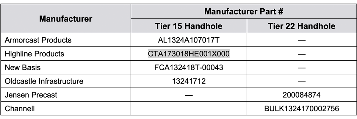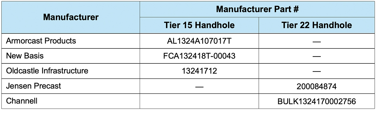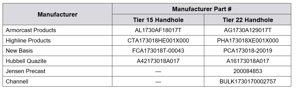 Table 1. 17" x 30" x 18" Handholes, Tire 15 and Tier 22
