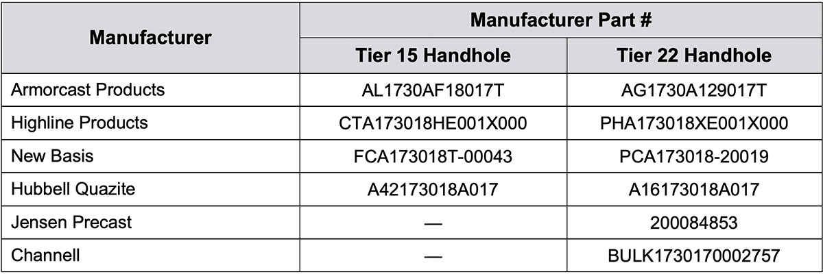 IMPORTANT: Tier 22 handholes may be substituted in place of Tier 15 if Tier 15 handholes are unavailable. Any other handhole substitutions are allowed only with prior approval from PGE.