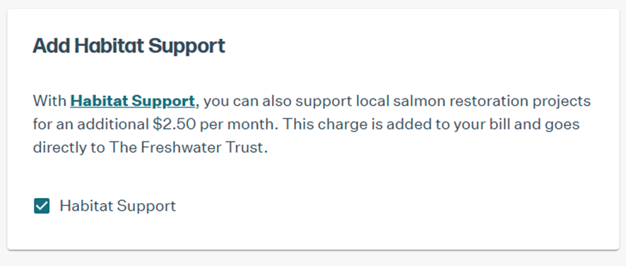 When you sign up for Green Future programs, you can add Habitat Support for just $2.50 extra per month. 100% of your donation will go directly to The Freshwater Trust, dedicated to the restoration of local fish habitats.
