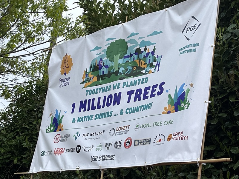 A poster celebrating Friends of Trees millionth tree planting hangs high over the event.