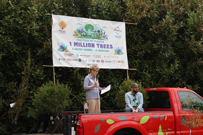 PGE CEO, Maria Pope gives remarks ahead of Friends of Trees’ millionth tree planting.