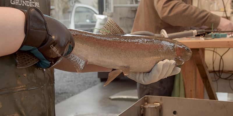 Of the 950 adult steelhead passed upstream, 675 traveled through Pelton Round Butte’s fish collection facility as juveniles. Young fish from the Upper Deschutes, Crooked, and Metolius Rivers are collected in Lake Billy Chinook at the Selective Water Withdrawal (SWW), a structure that enables fish to be safely transported around three dams to continue their migration to the ocean. The SWW also facilitates more natural conditions in the Lower Deschutes River by reducing temperature impacts from the dams.