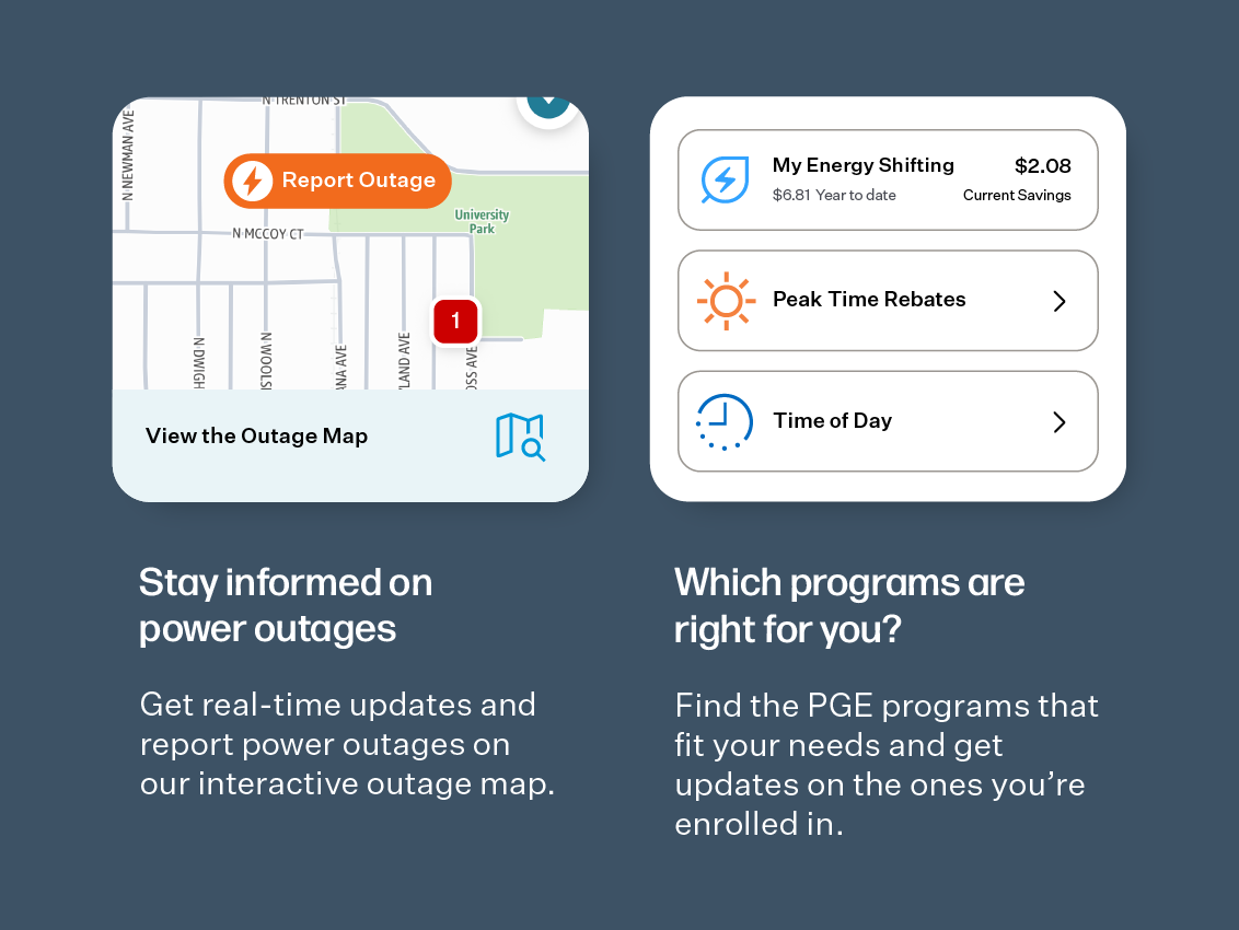 With a quick, secure login, you can monitor how much electricity you're using, explore personalized saving tips and use intuitive tools designed to help you make smart energy decisions. You can even track power outages and set custom alerts, bringing everything you need to optimize your PGE account into one convenient place.