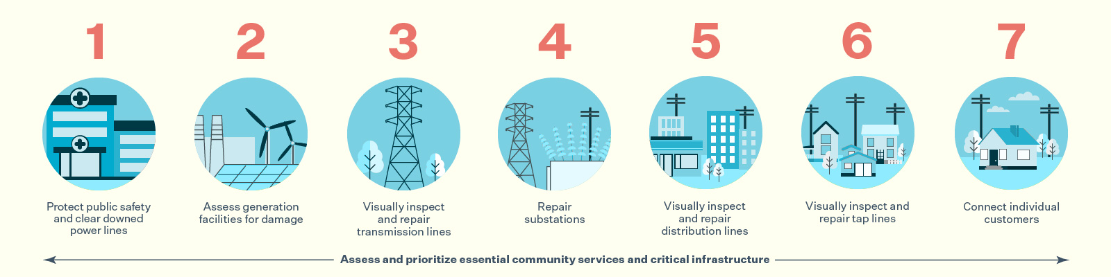 To restore power, first we ensure public safety, focusing on hospitals, water treatment facilities and other critical infrastructure. We then work to restore generation facilities and transmission lines, if needed, followed by outages affecting substations or distribution lines that serve many customers. From there, we address other outages affecting individual or small groups of customers.